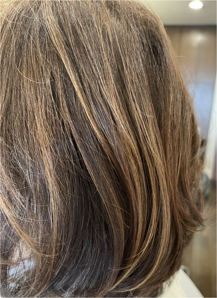 白髪の色を生かした染め方なので、地肌から白髪が伸びてきても、根元の白髪はさほど気にならないと思います。